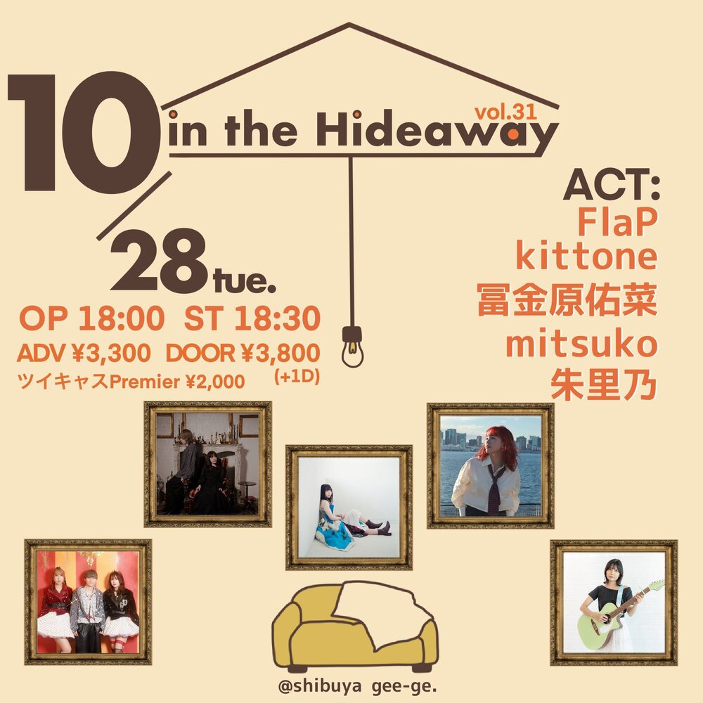 【LIVE】渋谷gee-ge. SCHEDULE 2025/10/28(火) 渋谷gee-ge. 地図を表示 OPEN 18:00 / START 18:30 10/28(火) タイトル 「 in the Hideaway 」vol.31 会場 渋谷gee-ge. OPEN 18:00 START 18:30 Ticket 前売り¥3,300+1D 当日¥3,800+1D 出演 FlaP kittone 富金原佑菜 mitsuko 朱里乃 ↓来場チケット予約 来場予約サイト ↓配信視聴チケット購入 配信視聴チケット購入 URLをコピーする 報告する