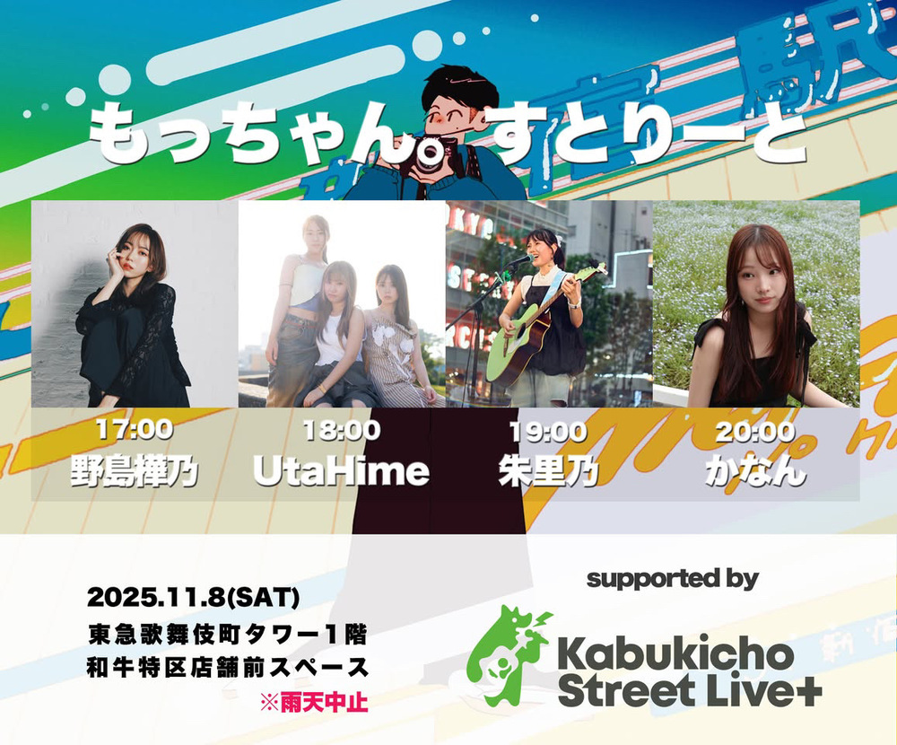 【LIVE】🆓もっちゃん。すとりーと SCHEDULE 2025/11/08(土) 東急歌舞伎町タワー1階 和牛特区前 新宿路上LIVEに出演します。 会場は 東急歌舞伎町タワー1階 和牛特区店舗前スペースです。 観覧無料でどなたでもご覧頂けます。 朱里乃の出演は19:00〜19:45! ※物販は出番後30分ほど行います。 URLをコピーする 報告する